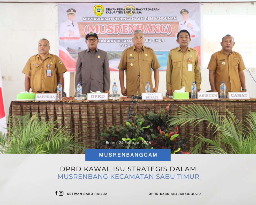 DPRD Kabupaten Sabu Raijua menegaskan komitmennya dalam mengawal perencanaan pembangunan daerah melalui partisipasi aktif pada kegiatan Musyawarah Perencanaan Pembangunan (Musrenbang) Tingkat Kecamatan Sabu Timur Tahun 2026. Kegiatan tersebut merupakan bagian dari tahapan perencanaan pembangunan daerah untuk Tahun 2027, sekaligus kelanjutan dari Musrenbang di tingkat desa. Dalam sambutannya, Karel O. Modjo Djami, S.Sos, Anggota DPRD Kabupaten Sabu Raijua, menyampaikan bahwa pembangunan adalah sebuah proses perubahan dan transformasi dari kondisi aktual yang masih dirasa kurang, menuju kondisi ideal yang diharapkan di masa depan. Baginya, Musrenbang menjadi forum strategis untuk menyerap aspirasi masyarakat sekaligus menyelaraskannya dengan arah kebijakan dan kemampuan keuangan daerah.