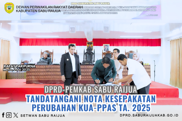 Dewan Perwakilan Rakyat Daerah (DPRD) Kabupaten Sabu Raijua dan Pemerintah Kabupaten (Pemkab) Sabu Raijua sepakati tahap penting pengelolaan keuangan daerah dengan menandatangani Nota Kesepakatan Bersama tentang Perubahan Kebijakan Umum Anggaran (KUA) dan Prioritas Plafon Anggaran Sementara (PPAS) Tahun Anggaran (TA) 2025. Acara tersebut berlangsung dalam Rapat Paripurna yang juga mengagendakan penyampaian dan penyerahan dokumen Rancangan Peraturan Daerah (Ranperda) Pertanggungjawaban Pelaksanaan Anggaran Pendapatan dan Belanja Daerah (APBD) Kabupaten Sabu Raijua TA 2024.