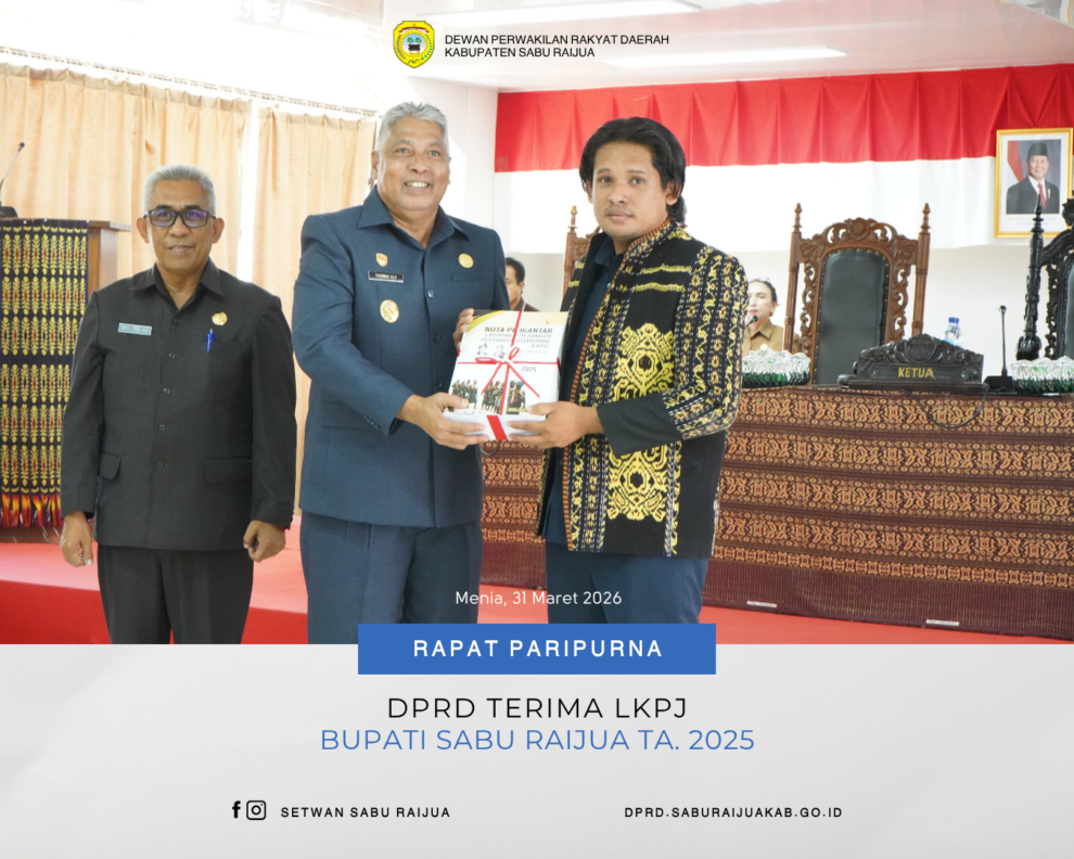 Rapat Paripurna Penyampaian Penjelasan dan Penyerahan Dokumen Laporan Keterangan Pertanggungjawaban (LKPJ) Bupati Sabu Raijua Tahun Anggaran 2025 dipimpin oleh Ketua DPRD Kabupaten Sabu Raijua, Rae Edin Saputra Manoe Lado. Dalam sambutannya, Ketua DPRD memberikan apresiasi kepada Pemerintah Daerah atas penyampaian dokumen LKPJ yang diserahkan secara tepat waktu. Langkah tersebut dinilai Ketua DPRD sebagai wujud nyata sinergitas dan komitmen yang baik antara pihak eksekutif dan legislatif dalam mengawal jalannya pembangunan di Kabupaten Sabu Raijua.