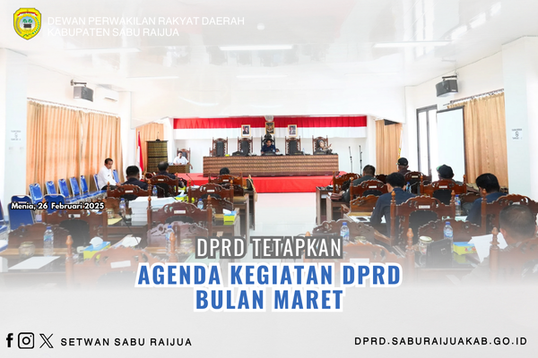 Rapat pembahasan kegiatan DPRD Kabupaten Sabu Raijua bulan Maret tahun 2025. Jadwal tersebut memuat agenda kunjungan kerja, rapat komisi serta konsultasi AKD. Rapat tersebut dipimpin oleh Ketua DPRD, Rae Edin Saputra Manoe Lado yang diikuti oleh Wakil Ketua DPRD, Anindha Maharani Alboneh, para Anggota DPRD, Sekretaris DPRD, staf sekretariat dan tenaga ahli DPRD.