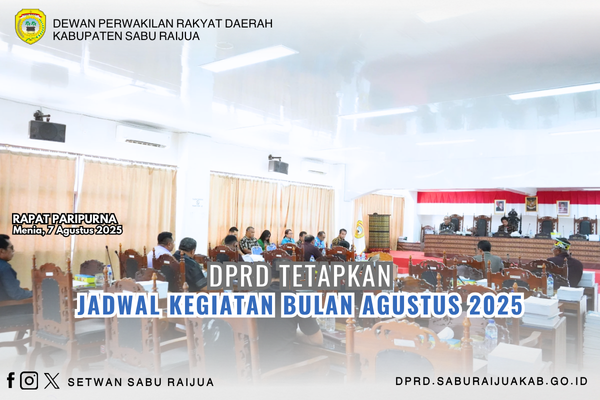 Rapat Paripurna ke-18 DPRD Kabupaten Sabu Raijua Masa Persidangan III Tahun Sidang 2024/2025. Rapat yang dipimpin oleh Ketua DPRD, Rae Edi Saputra Manoe Lado tersebut menyepakati jadwal rapat kerja komisi, rapat badan pembentukan perda, jadwal penyampaian dokumen ranperda RPJMD, jadwal konsultasi koordinasi serta kunjungan kerja DPRD.