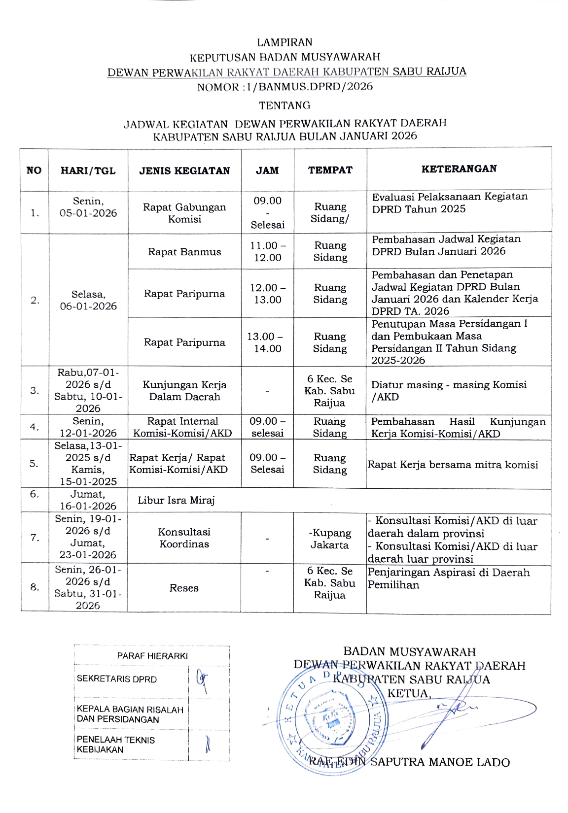 dprdsaburaijua Share This! FacebookXPinterestLinkedIn Agenda DPRD Jadwal Kegiatan DPRD Kabupaten Sabu Raijua Bulan Januari 2026 4 minggu ago7 Views1 Min Read Jadwal Kegiatan DPRD Kabupaten Sabu Raijua Bulan Januari 2026 sesuai keputusan Badan Musyawarah Nomor : 1/BANMUS.DPRD/2026 tanggal 06 Januari 2026 You may also like Agenda • Agenda DPRD Jadwal Kegiatan DPRD Kabupaten Sabu Raijua Perubahan Bulan Oktober – November 2025 3 bulan ago Agenda • Agenda DPRD Jadwal Kegiatan DPRD Kabupaten Sabu Raijua Bulan Oktober – November 2025 3 bulan ago Agenda • Agenda DPRD Jadwal Kegiatan DPRD Kabupaten Sabu Raijua Bulan September 2025 3 bulan ago About the authorView All Posts dprdsaburaijua Kalender Kerja DPRD Kabupaten Sabu Raijua TA 2026 Share This! FacebookXPinterestLinkedIn