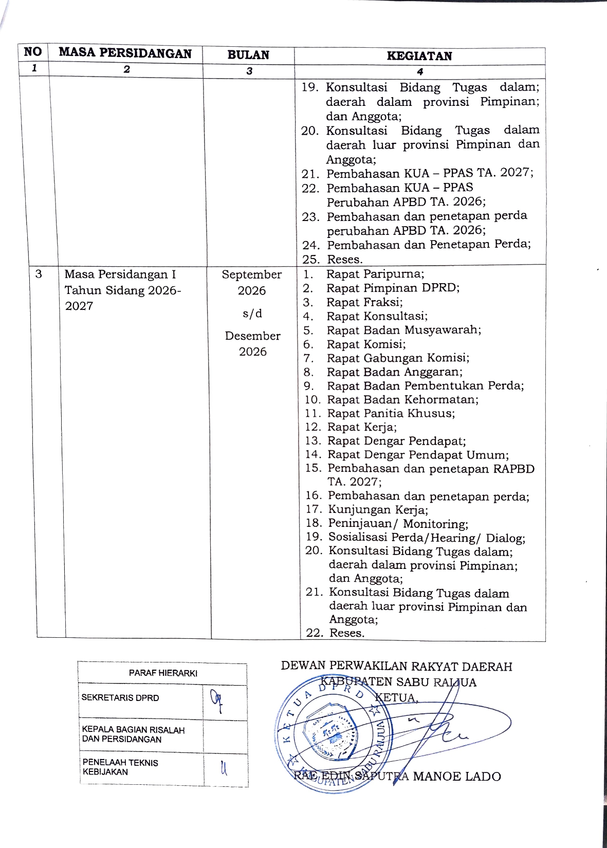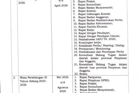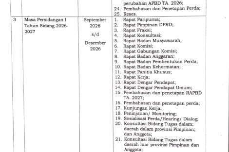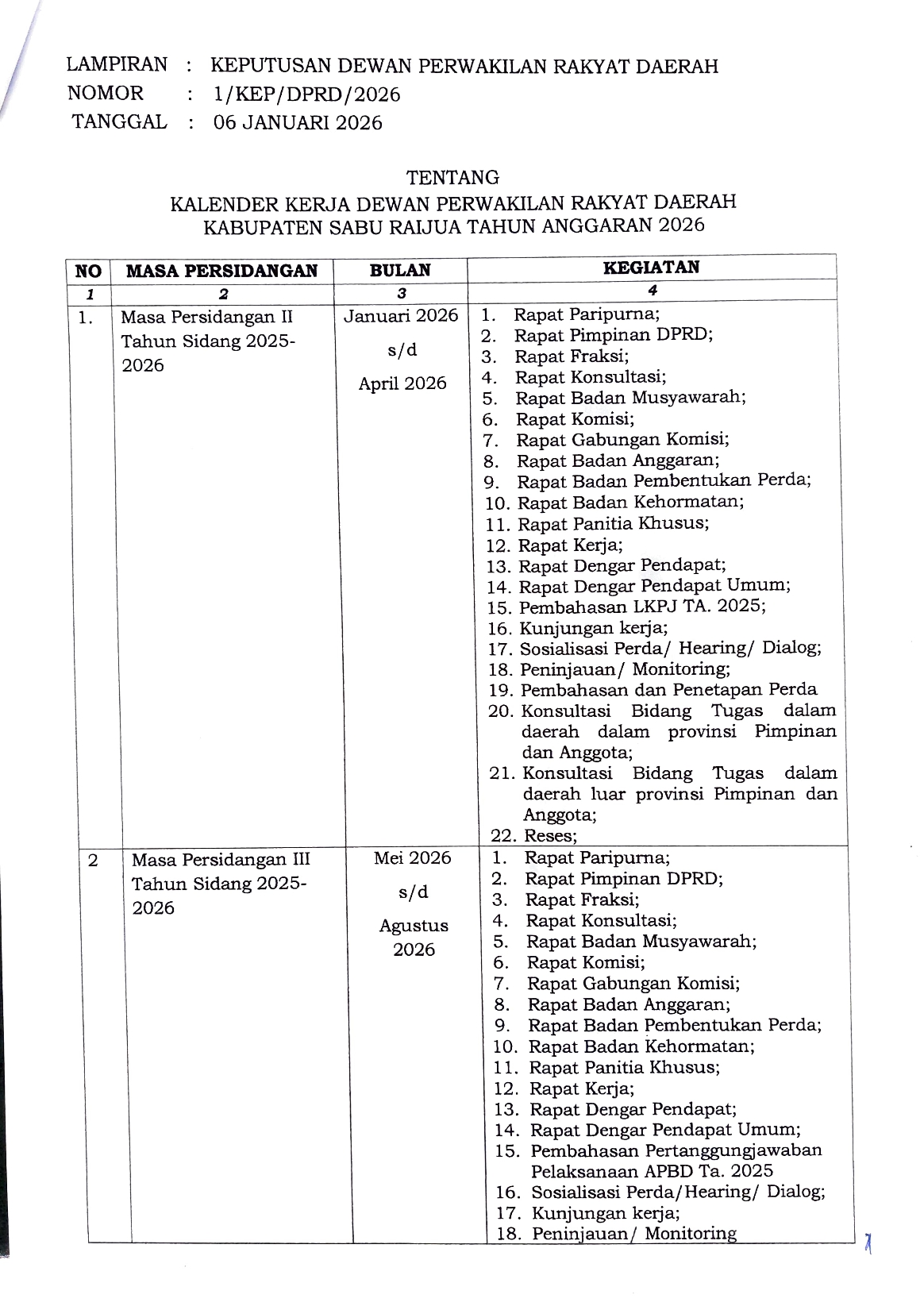 Keputusan DPRD Kabupaten Sabu Raijua Nomor : 1/KEP/DPRD/2026 Tentang Kalender Kerja DPRD Kabupaten Sabu Raijua Tahun Anggaran 2026 ditetapkan di Seba pada tanggal 06 Januari 2026 oleh Ketua DPRD Kabupaten Sabu Raijua, Rae Edin Saputra Manoe Lado dirincikan sebagai berikut :