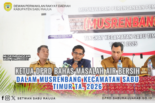 Hadir dalam Musrenbangcam tersebut Ketua DPRD Kabupaten Sabu Raijua, Rae Edin Saputra Manoe Lado bersama dengan Anggota DPRD dari Dapil 2 yang mewakili Kecamatan Sabu Timur, Kecamatan Sabu Tengah dan Kecamatan Sabu Liae, yakni, Karel O. Modjo Djami, S.Sos., Yerdinas Djita, Swingly Dala Ngapa, Laurens A. Ratu Wewo, S.Sos. dan Weldi Dogenes Ga Loni. Dalam sambutannya, persoalan ketersediaan air bersih menjadi perhatian Ketua DPRD yang berasal dari Fraksi Golkar tersebut. Menurutnya, tantangan untuk mendapatkan akses air bersih menjadi permasalahan serius yang solusinya perlu ada kerjasama dalam meningkatkan distribusi air bersih, membangun fasilitas penampungan air serta menjaga kelestarian sumber-sumber air yang ada.