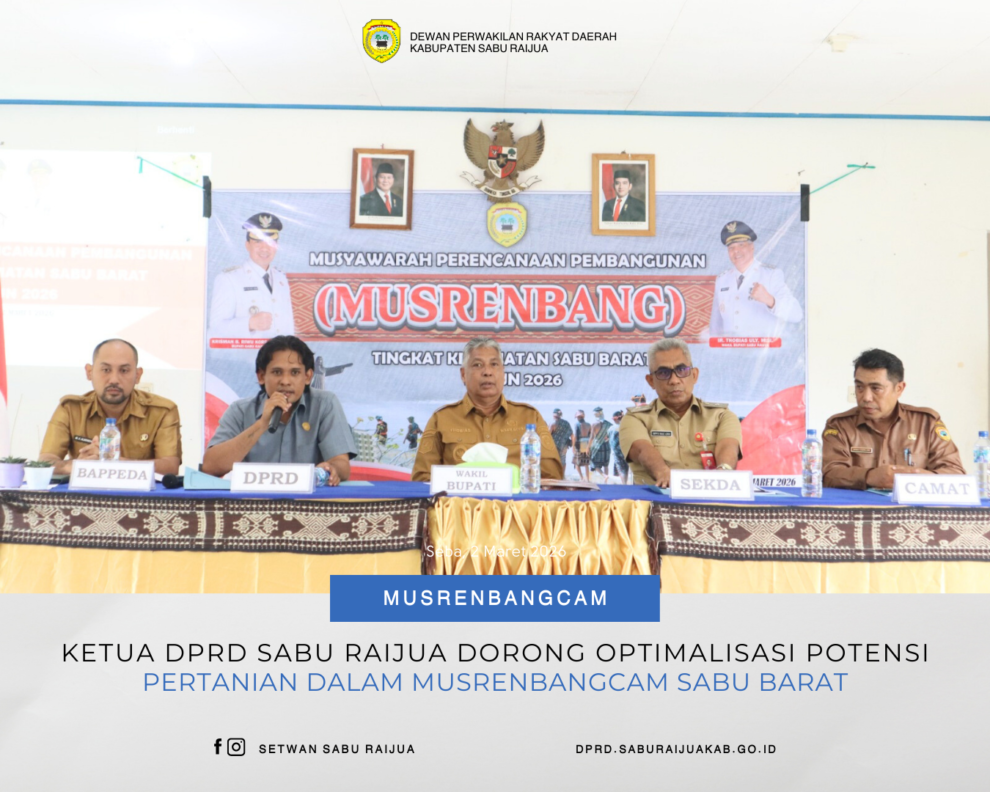 Ketua DPRD Kabupaten Sabu Raijua, Rae Edin Saputra Manoe Lado, menghadiri kegiatan Musrenbangcam Tingkat Kecamatan Sabu Barat yang berlangsung di Aula Tunu Robo, Kantor Camat Sabu Barat. Pada kesempatan tersebut, turut hadir Anggota DPRD Kabupaten Sabu Raijua dari Daerah Pemilihan (Dapil) Sabu Barat lainnya, yakni Debora Babo Higa, Johanis Manu Hunga, Donserses Nara Lulu, dan Eklesia Nyola Ruti yang bersama-sama mengikuti seluruh rangkaian kegiatan dan menyerap aspirasi masyarakat.