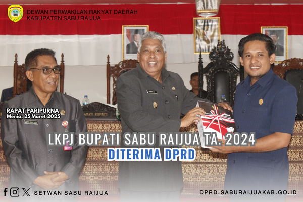 Rapat Paripurna Penyampaian Nota Pengantar Laporan Keterangan Pertanggungjawaban Bupati Sabu Raijua Tahun Anggaran 2024 dipimpin langsung oleh Ketua DPRD Kabupaten Sabu Raijua, Rae Edin Saputra Manoe Lado, yang dihadiri oleh Wakil Bupati Sabu Raijua, Sekretaris Daerah, Anggota DPRD Kabupaten Sabu Raijua, Staf Ahli Bupati, Asisten Sekda, Pimpinan Perangkat Daerah Lingkup Pemerintahan Kabupaten Sabu Raijua, para Staf Ahli DPRD serta insan pers.