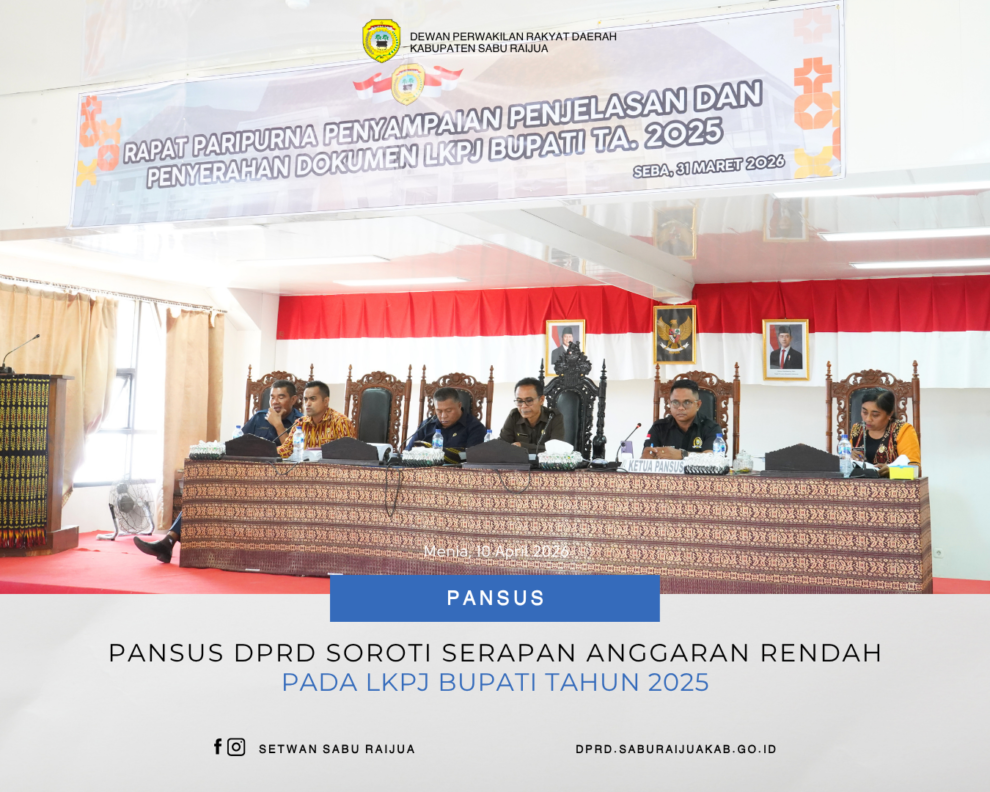 Panitia Khusus (Pansus) DPRD menggelar rapat kerja pembahasan dokumen Laporan Keterangan Pertanggungjawaban (LKPJ) Bupati Sabu Raijua Tahun 2025 dan mengidentifikasi rendahnya serapan anggaran di sejumlah Organisasi Perangkat Daerah (OPD). Rapat yang dipimpin oleh Ketua Pansus, Laurens A. Ratu Wewo, S.Sos bersama Wakil Ketua Pansus, Debora Babo Higa, Sekretaris Pansus, Markus Tuka dengan Anggota Pansus, Hendrik Tudu, SH., Frans Djara Liwe dan Donserses Nara Lulu. Berdasarkan hasil evaluasi dokumen, Pansus secara khusus menyoroti enam instansi yang hadir terutama pada item yang memiliki realisasi anggaran yang minim dan jauh dari target, yakni Badan Penanggulangan Bencana Daerah (BPBD), Dinas Pekerjaan Umum dan Perumahan Rakyat (PUPR), Dinas Perhubungan, Dinas Transmigrasi, Koperasi, UKM dan Tenaga Kerja, Dinas Lingkungan Hidup, serta Dinas Kesehatan, Pengendalian Penduduk dan Keluarga Berencana.