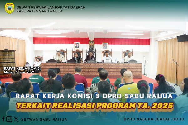 Rapat Kerja Komisi 3 DPRD Kabupaten Sabu Raijua dipimpin oleh Ketua Komisi, Laurens A. Ratu Wewo, S.Sos bersama Wakil Ketua Komisi, Donserses Nara Lulu, Sekretaris Komisi, Dominggus Uly Binus, S.Kep., Ns., dan Anggota Komisi, Frans Djara Liwe dan Hendrik Tudu, SH. Rapat tersebut menghadirkan Dinas Pendidikan, Kepemudaan dan Olahraga, Dinas Kesehatan, Pengendalian Penduduk dan Keluarga Berencana, Dinas Pekerjaan Umum dan Perumahan Rakyat, serta Bagian Pengadaan Barang dan Jasa. Agenda rapat tersebut membahas realisasi program kegiatan Tahun Anggaran 2025.